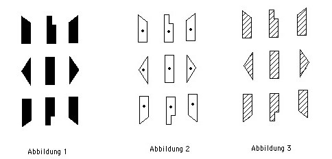 Stehen diese Richtungszeichen aus den Abbildungen 1, 2 und 3 in der Übertragungsspalte, haben sie folgende konkrete Bedeutungen: Abbildung 1: Das Bein ist leicht im Knie gebeugt, der Fuß steht auf der ganzen Sohle. Abbildung 2: Das Bein steht mit normal gestrecktem Bein, der Fuß steht auf der ganzen Sohle. Abbildung 3: Das Bein steht mit normal gestrecktem Bein, der Fuß steht auf dem Ballen.