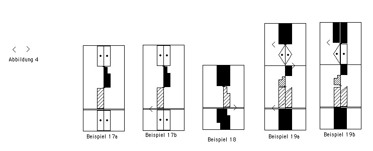 Soll nun diese einleitende Beingeste und das Neuansetzen bzw. Aufsetzen des Fußes nicht ausgeführt werden, d.h. es soll nur eine Gewichtsverlagerung geben auf das Bein, was eh schon auf dem Boden am richtigen Platz steht, wird diese Bewegung wie in Abbildung 4 und im Beispiel 17b mit der Verwendung der gewinkelten Klammer geschrieben. (Die Klammer „klammert“ also den Fuß bzw. das Bein am Boden fest und lässt nur eine Gewichtsverschiebung oder -verlagerung zu. Die Enden der Klammer weisen zu den Richtungszeichen hin, auf die sich die Klammer bezieht. Der untere Teil der Klammer steht neben der Ausgangsposition bzw. neben dem Ende der vorherigen Bewegung/Beinposition und der obere am Anfang der neuen Bewegung/neues Richtungszeichen). Hier in Beispiel 17b beginnt die Bewegung mit der Gewichtsverlagerung auf das linke Bein allein und dem Heben auf den Ballen.