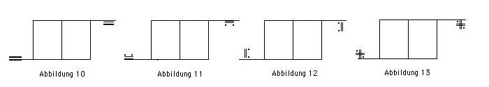 Abbildungen 10 bis 13 zeigen, dass die Entsprechungszeichen das zu wiederholende Motiv oder den zu wiederholenden Takt umrahmen: die Zeichen werden an den zu verlängernden Taktstrich paarweise geschrieben, das Entsprechungszeichen für den Anfang linksseitig unten über den Taktstrich und für das Ende rechtsseitig oben unter den Taktstrich. Der Taktstrich muss um mindestens ein Kästchen (des kleinkarierten Papiers) über die äußere Gestenspalte hinaus verlängert werden. Beim Gleichheitszeichen und beim Symmetriezeichen (Abbildungen 10 und 11) ist eine Linie des Zeichens identisch mit dem verlängerten Taktstrich.