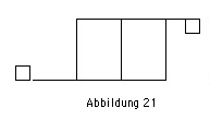Das Reprisenzeichen ist in Abbildung 21 zu sehen. Die kleinen Quadrate sollen mindestens ein Kästchen von der Gestenlinie nach außen entfernt sein. Das Zeichen umfasst jenen Teil des Motives, der wiederkehrt. Da bei langen Bewegungsfolgen auch mehrere Motive und ihre Bestandteile wiederkehren können, schreibt man in die Quadrate Großbuchstaben, um diese Abschnitte genau identifizieren zu können und voneinander zu unterscheiden. Die möglichen Varianten der Reprise werden mit den Entsprechungszeichen für die inneren Wiederholungen gekennzeichnet. Soll eine Reprise gleich bzw. identisch wiederholt werden, nutzt man z. B. das Wiederholungszeichen aus der Musik (ein schräger Strich mit den zwei Punkten).