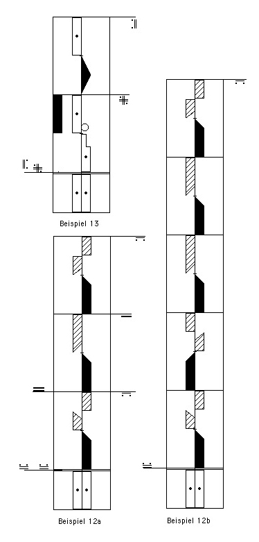 7. Die untergeordneten Wiederholungszeichen, die bestimmte Motive oder Takte umfassen, müssen natürlich von den übergeordneten Wiederholungszeichen, die die Gesamtbewegungsfolge umfassen, beachtet und ausgeführt werden. Letztere werden daher weiter außen und kräftiger bzw. größer geschrieben. (Beispiele 12 a, 13)