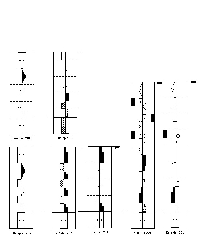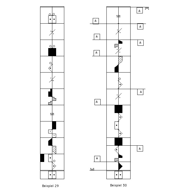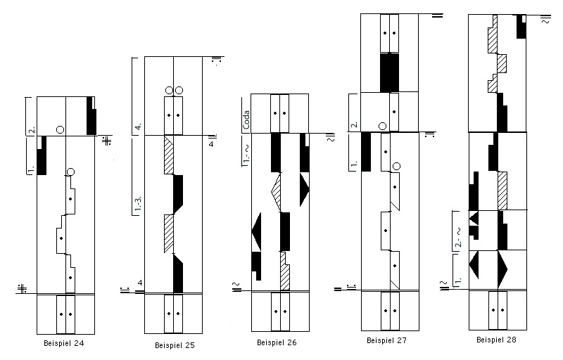 10. Die prima volta – seconda volta Schreibweise kann bei zu wiederholenden Motiven oder Motivreihen verwendet werden, bei deren Wiederholungen sich der Schluss, der Anfang (oder auch die Mitte) verändern. Die verstärkten waagerechten Linien vergleichbar den Taktstrichen zwischen den Varianten helfen beim Beachten der Veränderungen. (Abbildungen 24 – 28)