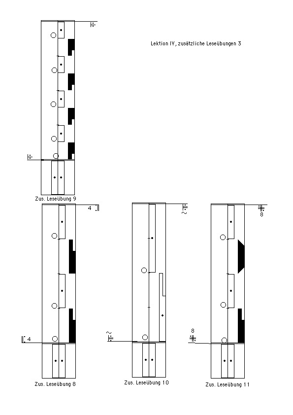 Bitte schreiben Sie alle Beispiele und Leseübungen aus den Lektionen I bis III neu auf, die sich mit äußeren Wiederholungszeichen einfacher schreiben lassen. Achten Sie darauf, die Taktarten beizubehalten (man kann beispielsweise nicht durch ein Wiederholungszeichen aus einem 4/4 Takt in einen 2/4Takt wechseln).