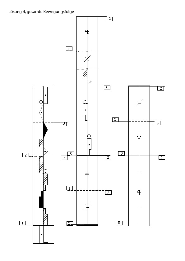 Merke: Zuerst werden die Bewegungen ausgeführt, die ausgeschrieben im Kinetogramm stehen, dann werden die Wiederholungszeichen ausgeführt, die nah an den ausgeschriebenen Bewegungen stehen (untergeordnete Wiederholungszeichen), danach werden die übergeordneten Wiederholungszeichen, die weiter außerhalb stehen und größer bzw. dicker geschrieben werden, ausgeführt.